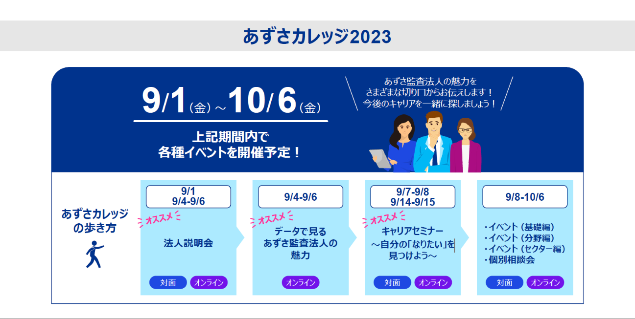 特に、法人説明会に加え、「データで見るあずさ監査法人の魅力」に参加いただくと、あずさ監査法人が選ばれている理由がよくわかるのでおすすめです。まだお申し込みしていない方はこの機会にぜひお申し込みください。